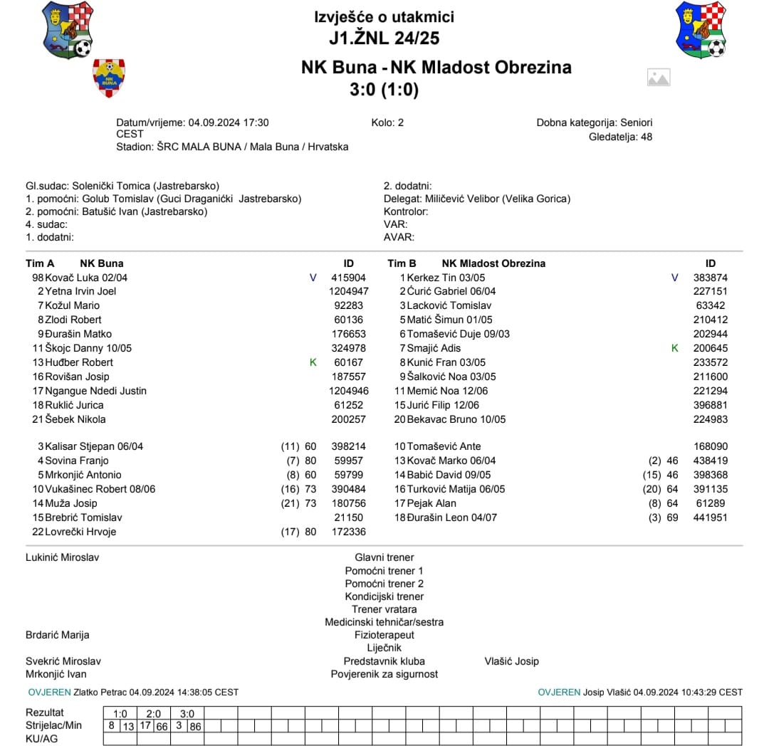 Buna je nakon dva odigrana kola stopostotna, nakon nedjeljne pobjede u gostima kod Dinama Hidrela, danas su s uvjerljivih 3-0 na domaćem terenu porazili goste iz Obrezine. Pogotke su postigli Robert Zlodi u 13., Justin Ngangue u 66. te Stjepan Kalisar u 86. minuti.