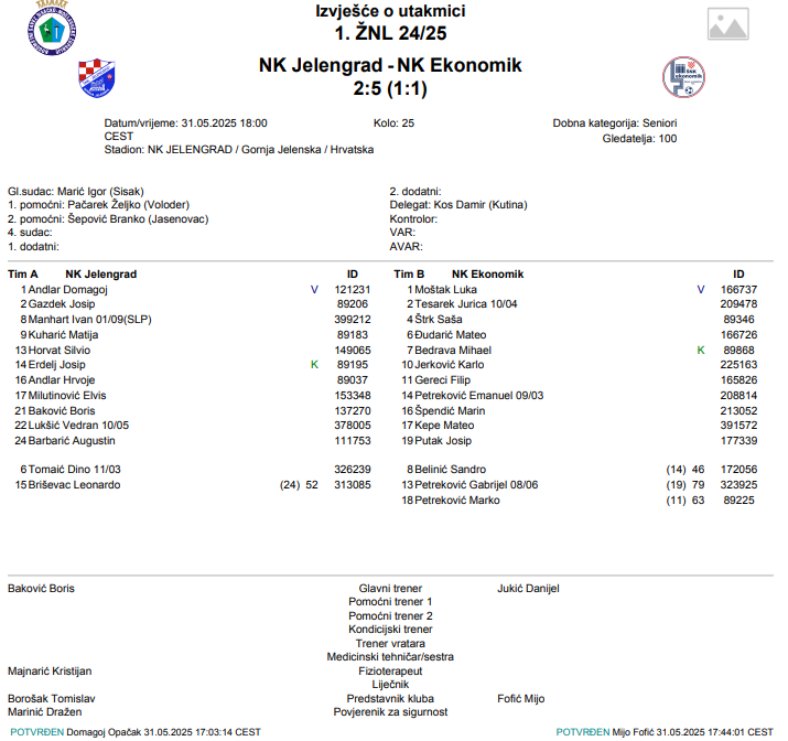 Posljednja utakmica 25. kola odigrana je u Jelengradu, gdje je NK Jelengrad ugostio Ekonomik. Gosti iz Donje Vlahinićke su slavili s 2:5, što je iznenađujući rezultat s obzirom na dosadašnje predstave. Ova pobjeda je važna za goste u pogledu poretka jer se nalaze u donjem dijelu tablice, a sada će moći s mirnoćom ući u završne kolo 1. ŽNL SMŽ. Ovaj rezultat pokazuje da u ligi nema sigurnih pobjeda i da svaka momčad može iznenaditi.