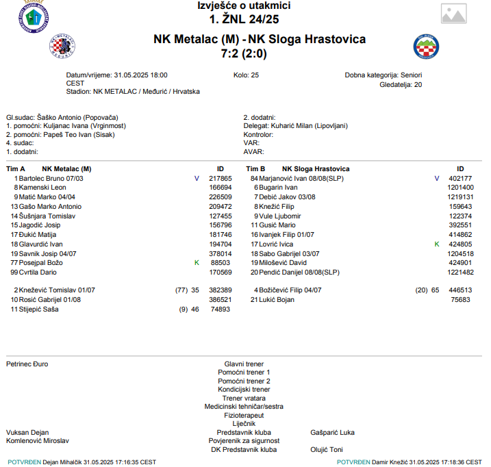 NK Metalac (M) je na svom terenu bio uvjerljiv protiv Sloge (H), slavivši s visokih 7:2. Domaćini su odigrali sjajnu napadačku utakmicu i potvrdili svoju poziciju u gornjem dijelu ljestvice. Sloga (H) je, s druge strane, doživjela težak poraz i morat će analizirati svoje pogreške uoči posljednjeg kola. Ovaj rezultat pokazuje da Metalac (M) ima kvalitetu za visoke plasmane.