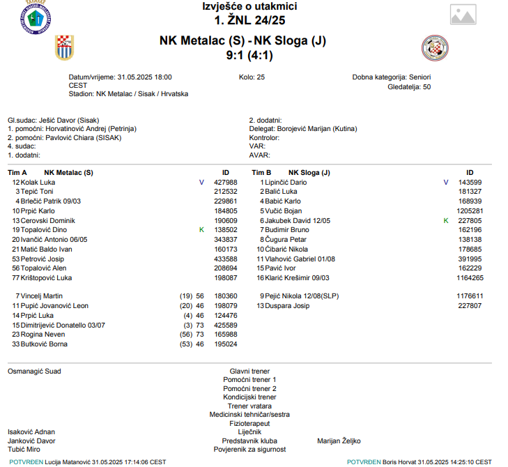 Iako je sisački Metalac osvojio naslov prvaka prije koje kolo, svaka utakmica koju sisačka ekipa Suada Osmanagića odigra je derbi kolo. Tako je i s ovom utakmicom odigranom u Sisku gdje su snage odmjerili NK Metalac (S) i NK Sloga (J). Domaći Metalac demonstrirao je silu i s uvjerljivih 9:1 deklasirao goste iz Jazavice. Ova visoka pobjeda nagovijestila je kako Metalac ne posustaje ni najmanje i kako žele ostalim timovima u 1. ŽNL, ali i 4. HNL skupine B dati do znanja da su spremni i da posjeduju određenu kvalitetu. Njihova gol razlika svjedoči o iznimnoj napadačkoj formi tijekom cijele sezone. S druge strane, Sloga (J) će morati brzo zaboraviti ovaj težak poraz i usredotočiti se na posljednje kolo.